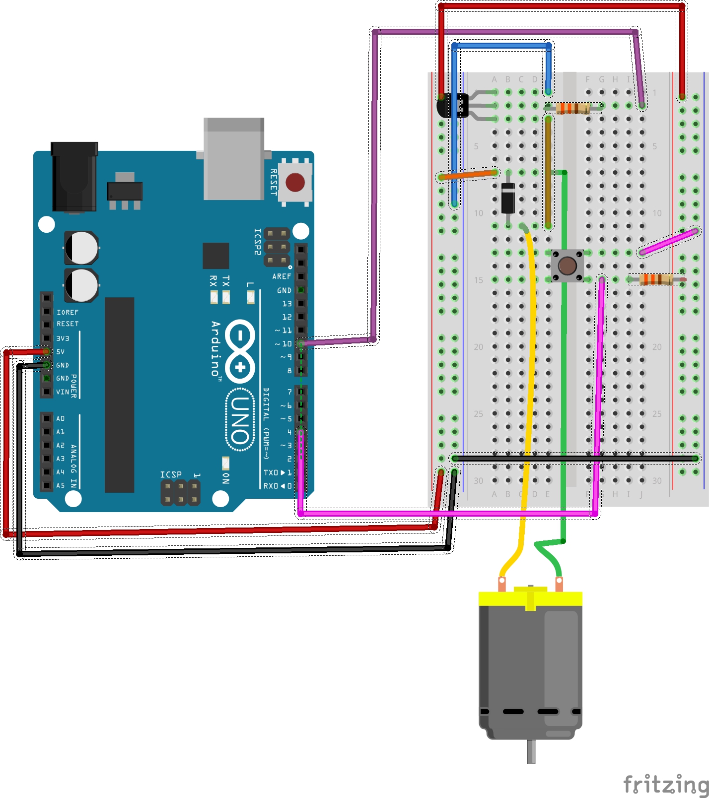 Se realiza un pequeño circuito, dicha práctica se basa en el uso de un microcontrolador, utilizando el lenguaje C++. Se utiliza un motor DC y un botón, conectando un motor al Pin4 (salida) y demás componentes requeridos para dicho funcionamiento del motor, el mismo procedimiento se utiliza para el botón al Pin10 (entrada).