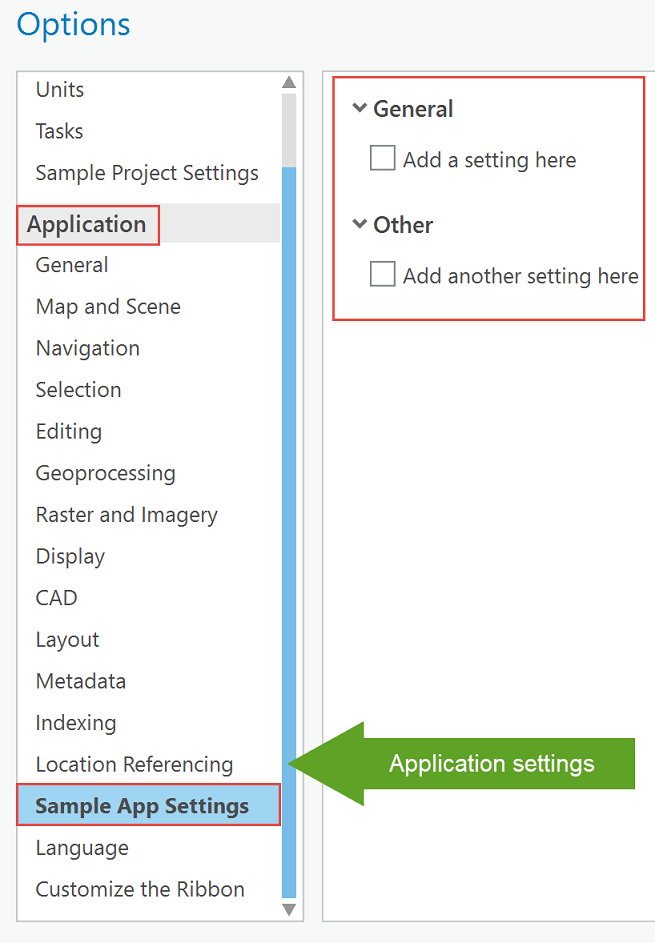 }We want the new property page to appear in Pro’s Options dialog under the “Application” section. Repeat the process you followed in Step 5: Add the Property Page to the Project Options in the Config.daml above.