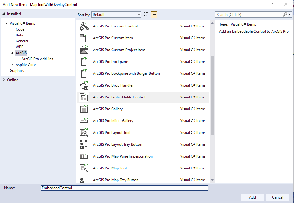 - Add a new ArcGIS Pro Add-ins | ArcGIS Pro Embeddable Control item to the add-in project, and name the item EmbeddedControl.