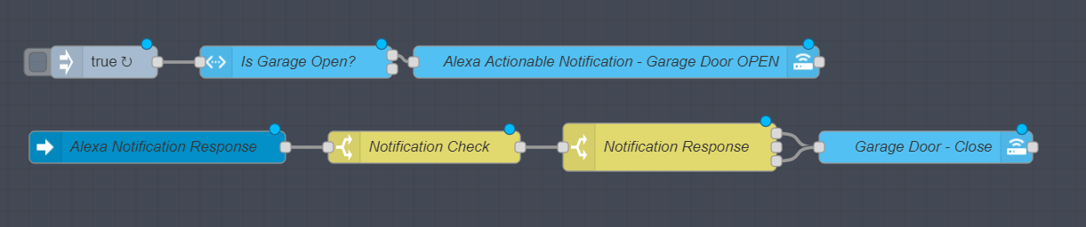 [{"id":"5a8efc97.c224f4","type":"api-call-service","z":"e8fe01ef.ddafd","name":"Alexa Actionable Notification - Garage Door OPEN","server":"9f230d2c.1e00d","version":1,"debugenabled":false,"service_domain":"script","service":"activate_alexa_actionable_notification","entityId":"","data":"{\"text\":\"Its getting late and the garage is still open. Would you like me to close it?\",\"event_id\":\"actionable_notification_garage\",\"alexa_device\":\"media_player.your_device\"}","dataType":"json","mergecontext":"","output_location":"","output_location_type":"none","mustacheAltTags":false,"x":750,"y":1240,"wires":[[]]},{"id":"b81c86aa.cffd98","type":"api-current-state","z":"e8fe01ef.ddafd","name":"Is Garage Open?","server":"cf2d0f67.b78c5","version":1,"outputs":2,"halt_if":"open","halt_if_type":"str","halt_if_compare":"is","override_topic":false,"entity_id":"cover.your_device","state_type":"str","state_location":"payload","override_payload":"msg","entity_location":"data","override_data":"msg","blockInputOverrides":false,"x":430,"y":1240,"wires":[["5a8efc97.c224f4"],[]]},{"id":"29219c0.fd93164","type":"inject","z":"e8fe01ef.ddafd","name":"","topic":"","payload":"true","payloadType":"bool","repeat":"","crontab":"42 19 * * *","once":false,"onceDelay":0.1,"x":250,"y":1240,"wires":[["b81c86aa.cffd98"]]},{"id":"f2a004b3.987308","type":"api-call-service","z":"e8fe01ef.ddafd","name":"Garage Door - Close","server":"cf2d0f67.b78c5","version":1,"debugenabled":false,"service_domain":"cover","service":"close_cover","entityId":"cover.your_device","data":"","dataType":"json","mergecontext":"","output_location":"","output_location_type":"none","mustacheAltTags":false,"x":1020,"y":1360,"wires":[[]]},{"id":"1cc5f7ea.344078","type":"switch","z":"e8fe01ef.ddafd","name":"Notification Response","property":"payload.event.event_response","propertyType":"msg","rules":[{"t":"eq","v":"ResponseYes","vt":"str"},{"t":"eq","v":"ResponseNo","vt":"str"},{"t":"eq","v":"ResponseNone","vt":"str"}],"checkall":"true","repair":false,"outputs":3,"x":780,"y":1360,"wires":[["f2a004b3.987308"],[],["f2a004b3.987308"]]},{"id":"1b3e6beb.9ca094","type":"switch","z":"e8fe01ef.ddafd","name":"Notification Check","property":"payload.event.event_id","propertyType":"msg","rules":[{"t":"eq","v":"actionable_notification_garage","vt":"str"}],"checkall":"true","repair":false,"outputs":1,"x":550,"y":1360,"wires":[["1cc5f7ea.344078"]]},{"id":"4778008.13c87","type":"server-events","z":"e8fe01ef.ddafd","name":"Alexa Notification Response","server":"cf2d0f67.b78c5","event_type":"alexa_actionable_notification","exposeToHomeAssistant":false,"haConfig":[{"property":"name","value":""},{"property":"icon","value":""}],"x":300,"y":1360,"wires":[["1b3e6beb.9ca094"]]},{"id":"9f230d2c.1e00d","type":"server","z":"","name":"Home Assistant","legacy":false,"addon":true,"rejectUnauthorizedCerts":true,"ha_boolean":"y|yes|true|on|home|open","connectionDelay":false,"cacheJson":true},{"id":"cf2d0f67.b78c5","type":"server","z":"","name":"Home Assistant"}]