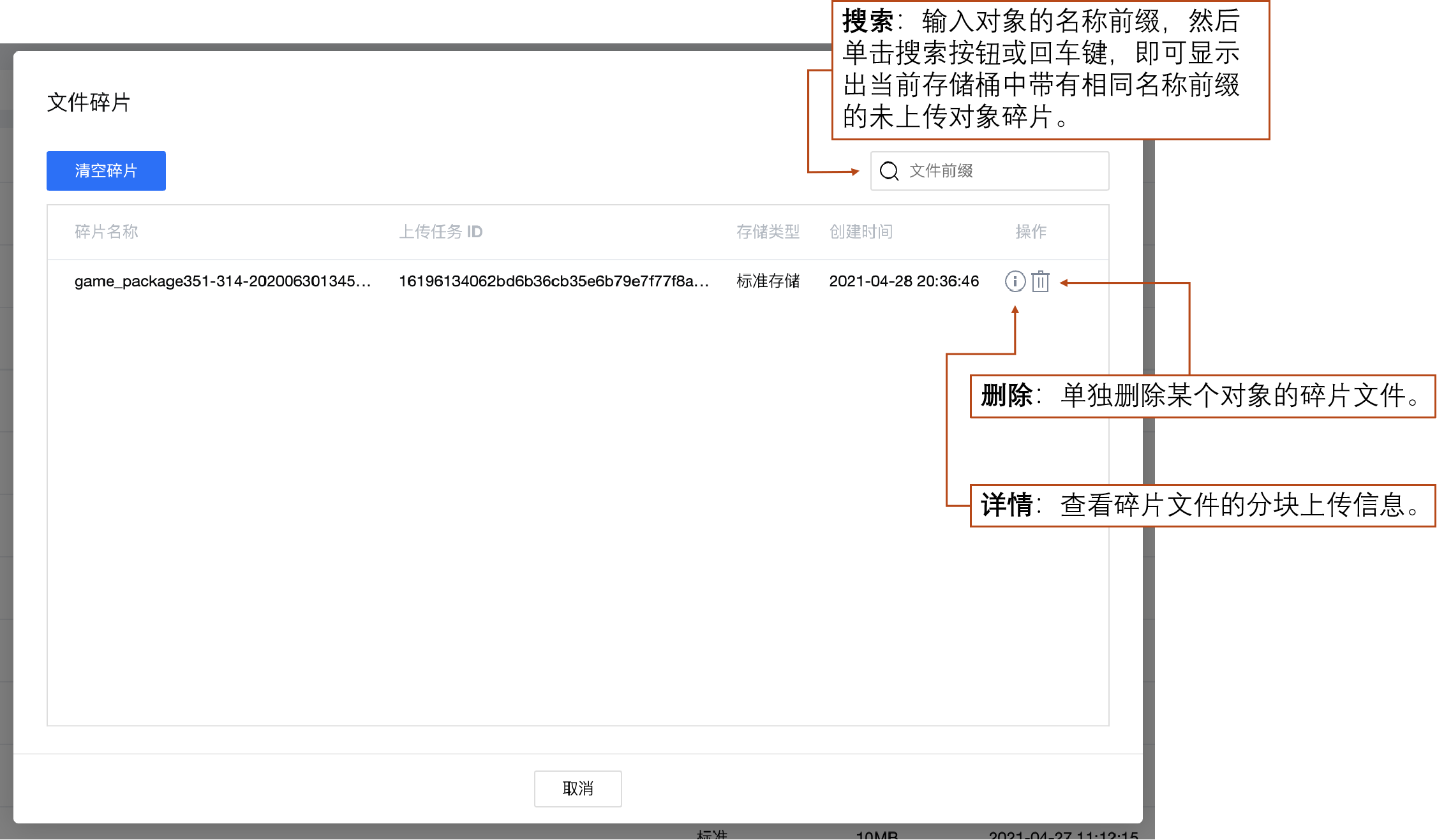 当您在上传对象过程中,暂停或取消上传时可能产生文件碎片。您可单击文件列表上方的查看 > 文件碎片来查看文件碎片,支持按前缀搜索和清空所有文件碎片。