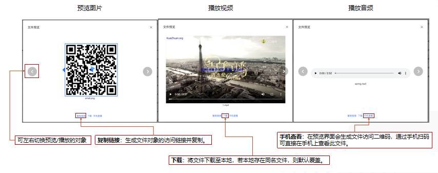 - 预览支持大多数图片格式,视频格式仅支持 mp4、webm,音频格式仅支持 mp3、wav。