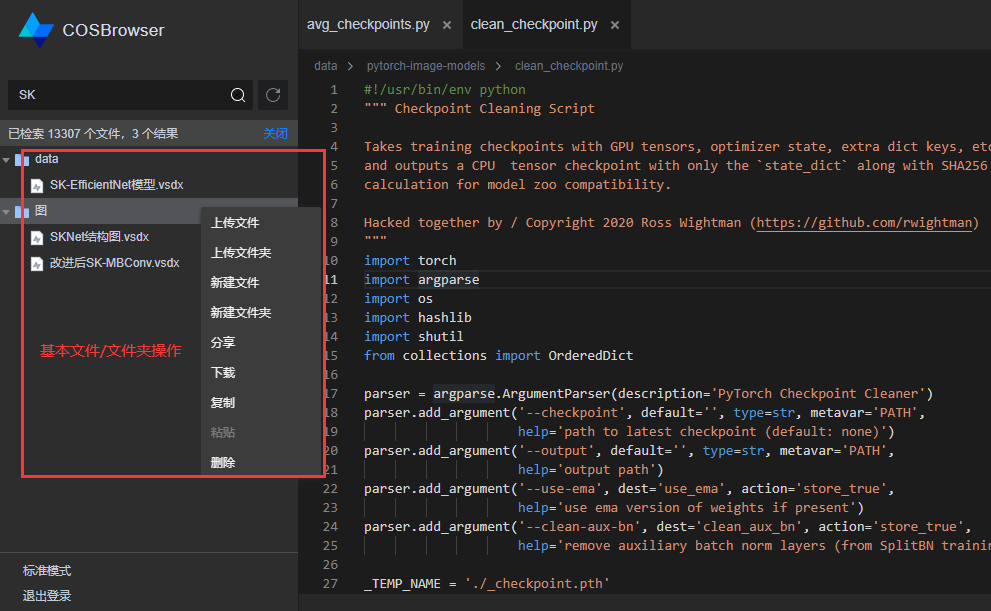 COSBrowser编辑器模式提供了基本的文件/文件夹操作,具体功能操作说明可参见标准模式说明文档。