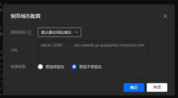 COSBrowser编辑器模式提供网站域名的配置信息,单击页面右上角**...选择预览域名配置**,指定域名和链接类型即可。若开启静态网站,则需将指定域名设为默认静态网站域名才可进行访问。