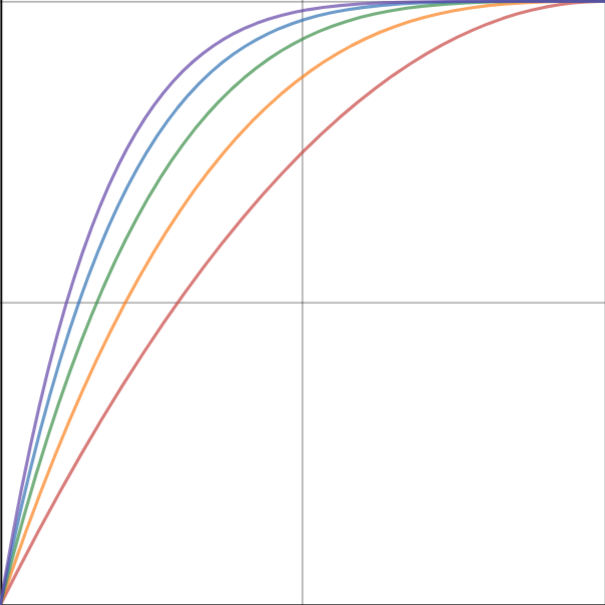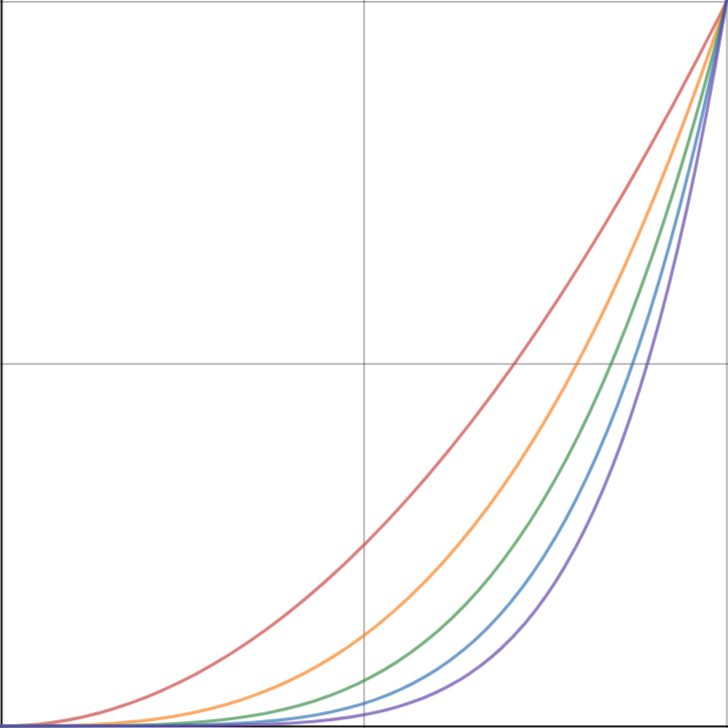 }Next, we do the most simple operation of the three remaining conditions. If easeIn is true and easeOut is false, then we simply return our input t to the power of exponent using the Math.pow function. Because of how math works, 0x is always 0 and 1x is always 1, so no transformations are needed: