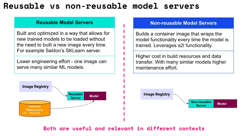 不可重用模型服务器:专用于服务单个模型的专用服务器。不需要中央存储库,但需要为每个模型构建一个新映像。