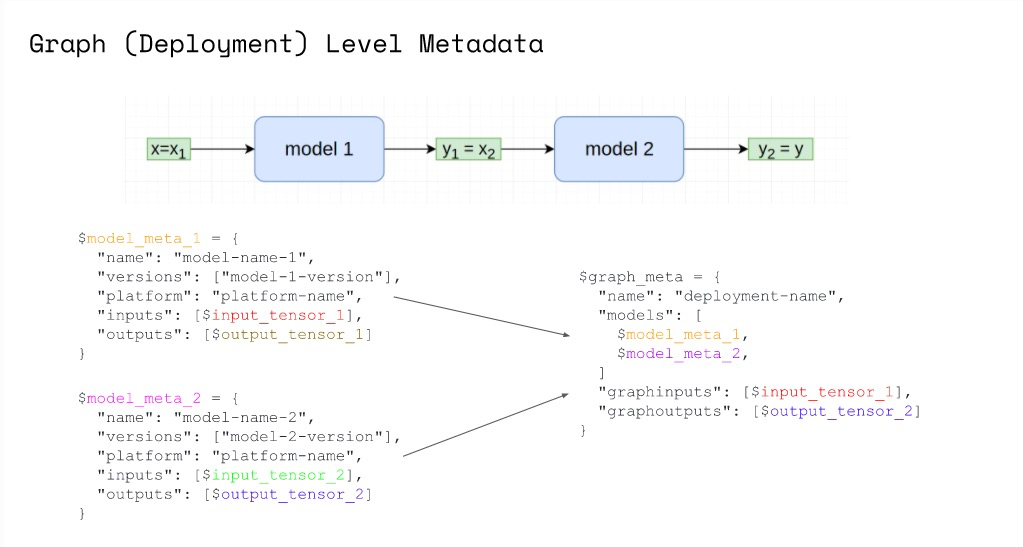 class Model: ... def init_metadata(self): meta = { "name": "my-model-name", "versions": ["my-model-version-01"], "platform": "seldon", "inputs": [ { "messagetype": "tensor", "schema": {"names": ["a", "b", "c", "d"], "shape": [4]}, } ], "outputs": [{"messagetype": "tensor", "schema": {"shape": [1]}}], } return meta