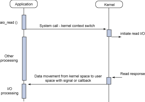 异步aio是当下linux使用最广的io方式。上文中介绍的都属于同步io,io API调用后,都会返回相应的结果,而异步io则不能立即得到相应的结果。aio是异步非阻塞io,即io调用后会立即返回,说明io已经发起了,但io的结果并没有得到,在下层处理io的时间内,可以执行其他程序,当结果得到后,会通知程序,io完成。如下图(read)所示:
