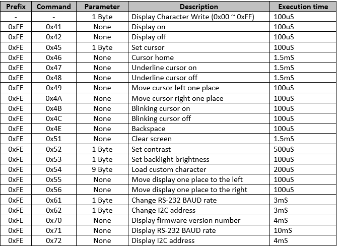 For our display the default address of the slave device is 0x50. The following table contains the available commands with their corresponding address: