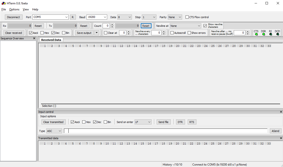 With this project we will set up a serial communication between the microcontroller and the computer using the UART protocol. The first thing we need is a way to test the code. Download Hterm, a virtual interface to simulate serial input and output. The program doesn't need installation, just launch the .exe file. Connect the XMC 4700 from the debugger micro USB to the PC and select the right COM port on the Hterm terminal. Then set the other parameter according to the following image: