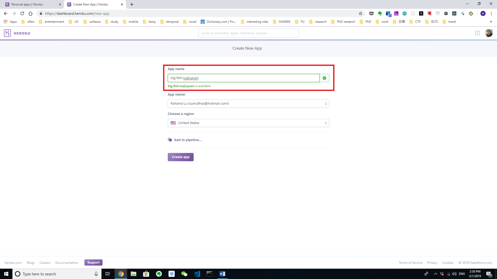 填写App name,其它项保持默认,点击Create app按钮。这样我们就成功创建了一个heroku服务器。要注意的是,这里App name要确保全世界不重名,所以我在big-fish后面又加了一个-luqiuyuan。