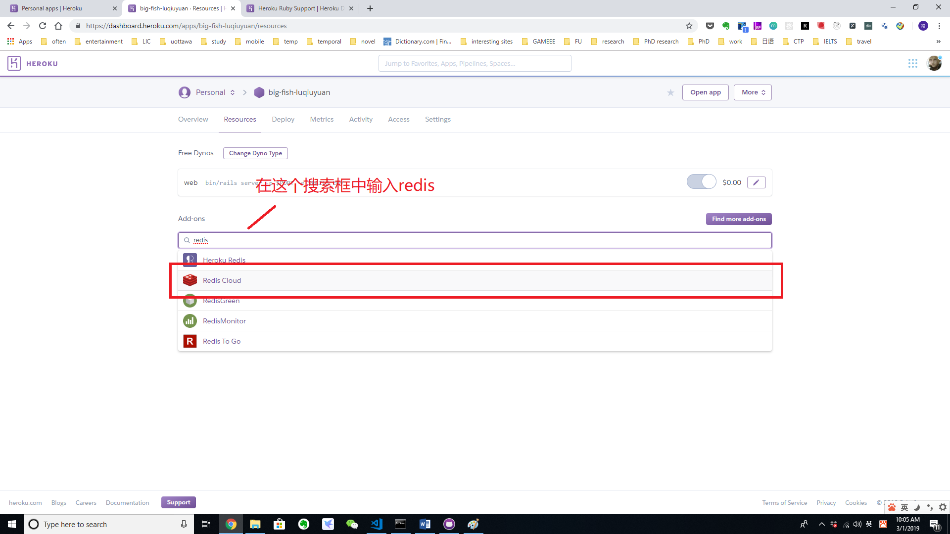 在Add-on一栏下的搜索框中输入redis,然后在弹出的列表中点击Redis Cloud。Heroku默认帮我们选择的套餐是一个免费套餐,足够使用,点击Provision按钮。至此我们的数据库就添加完成。