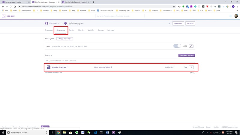 打开这个服务器,在顶部标签中找到Resources标签,打开它。这个标签会显示我们服务器上挂载的数据库和其它资源,我们也要在这里添加数据库。其实,在我们创建服务器时,heroku已经帮我们挂载好了PostgreSQL数据库,所以我们只要再添加一个Redis数据库就可以了。
