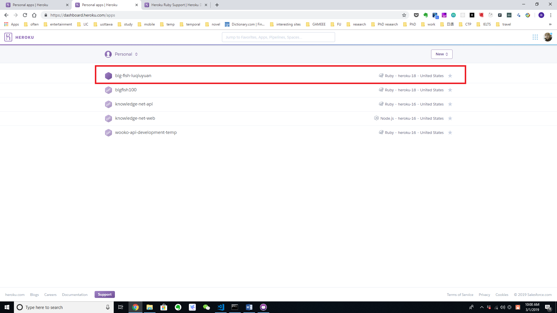 打开heroku.com,你会发现在主页上多了一个服务器,即我们在第3步新建的服务器。