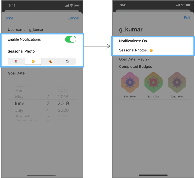 在地标应用程序中,用户可以创建一个个人资料页来表达他们的个性。为了让用户能够更改他们的个人简介,您将添加一个编辑模式,并设计一个偏好设置页面。