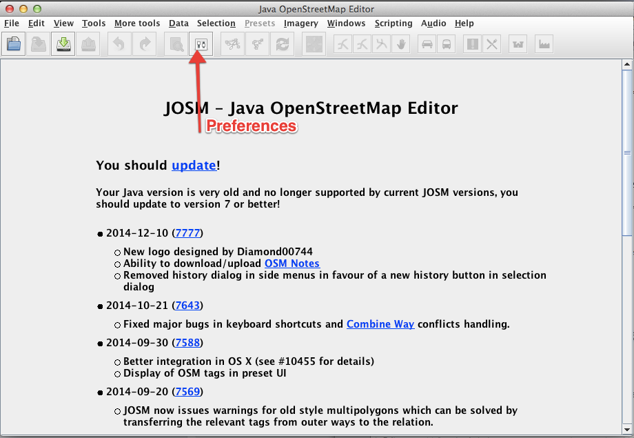 Una vez que JOSM está en funcionamiento es algo parecido a esto. Ir a buscar el diálogo de preferencias, lo necesitarás para el próximo par de pasos. Puede acceder a él desde la parte baja del icono de interruptor de luz.