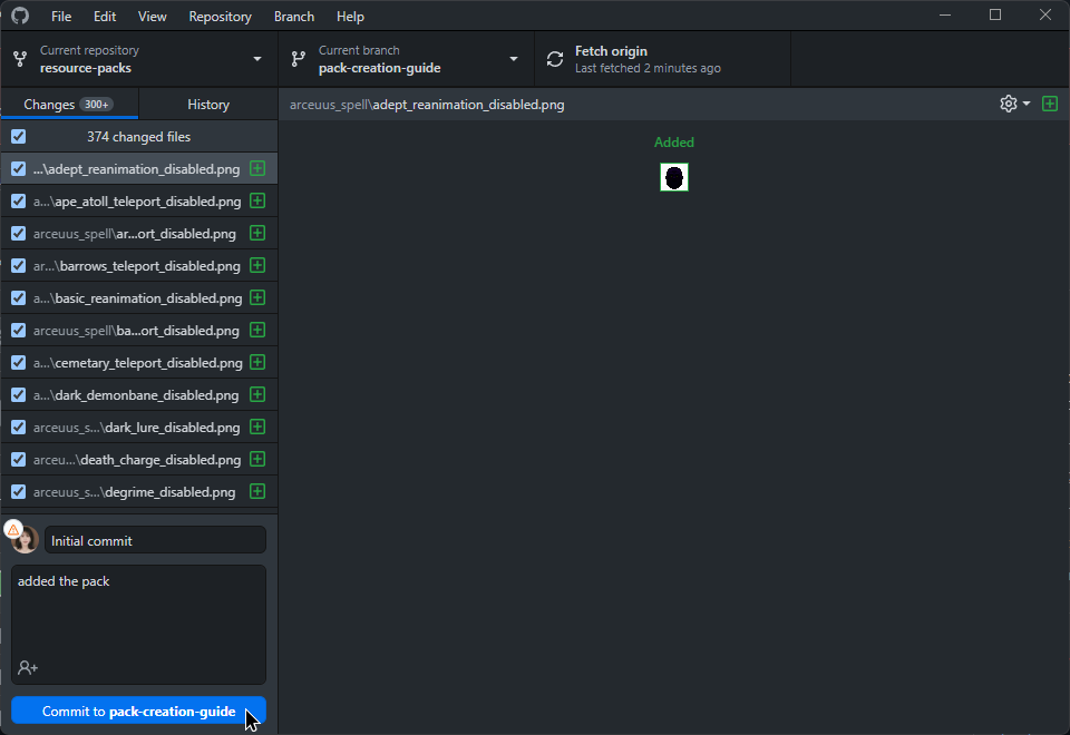 <your pack's name>"). Double check to see if everything is selected for your first commit. -