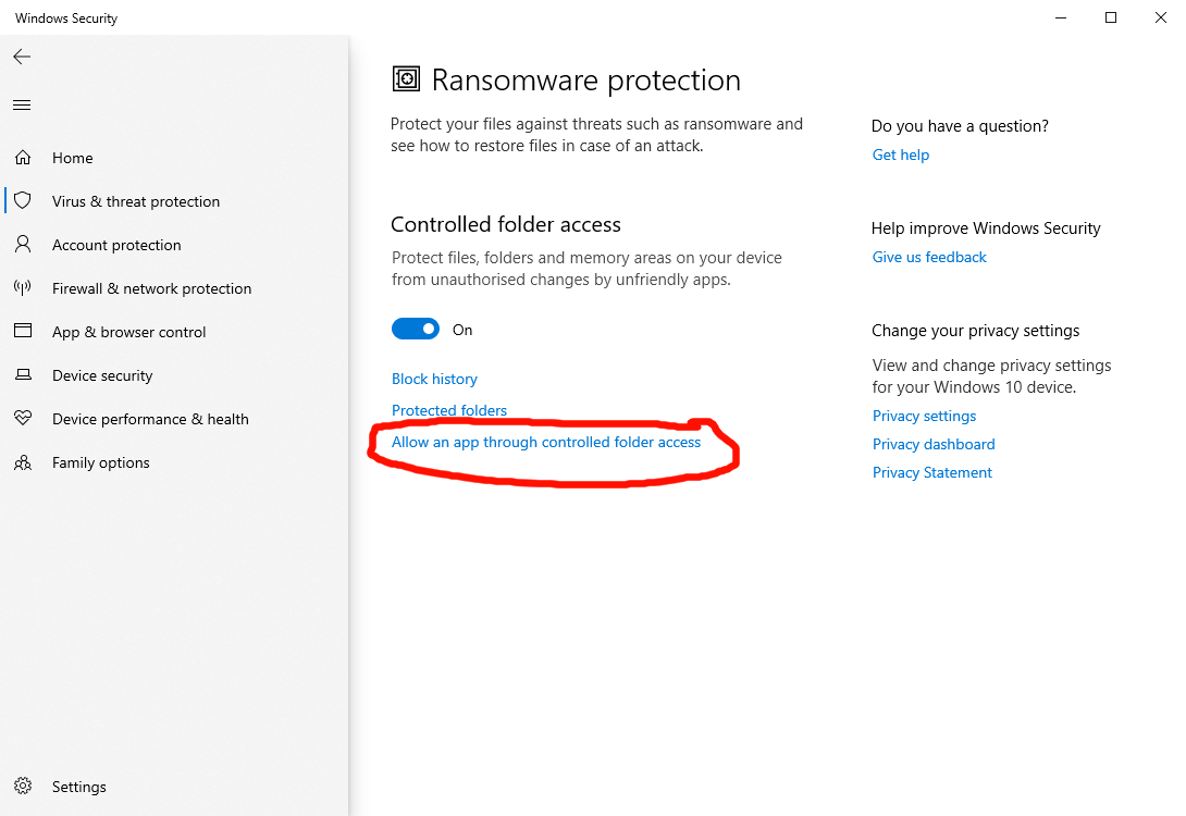 Left-Click "Allow an app through controlled folder access"