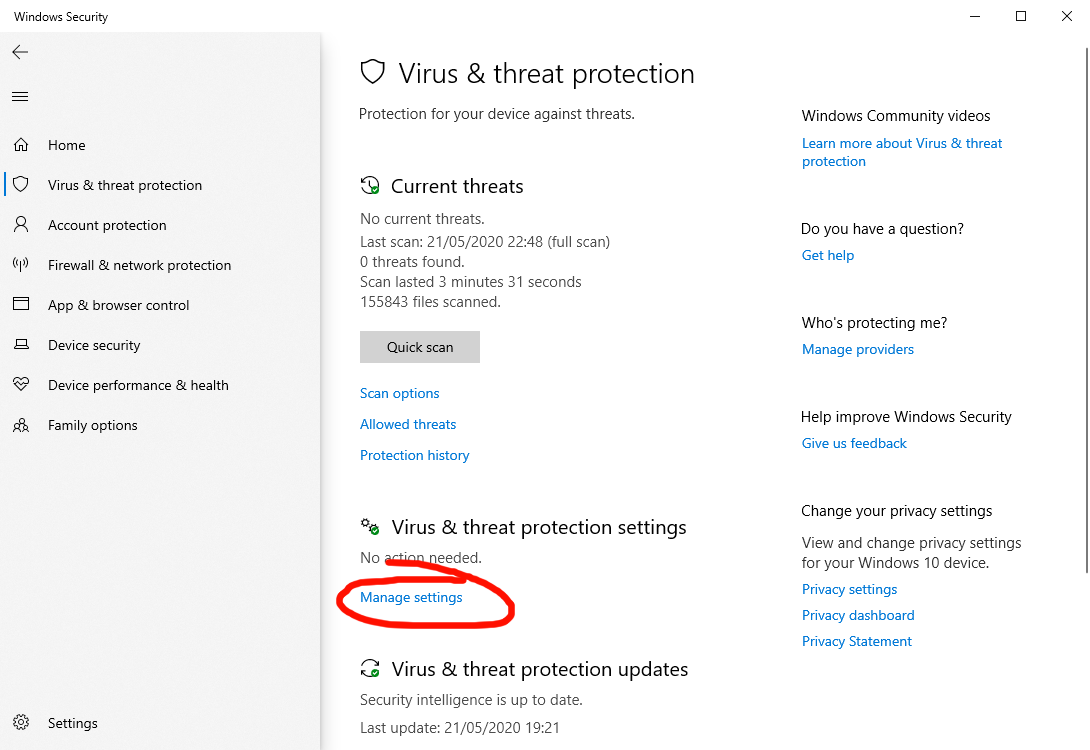 From there, Left-Click "Manage settings" under "Virus & threat protection settings"