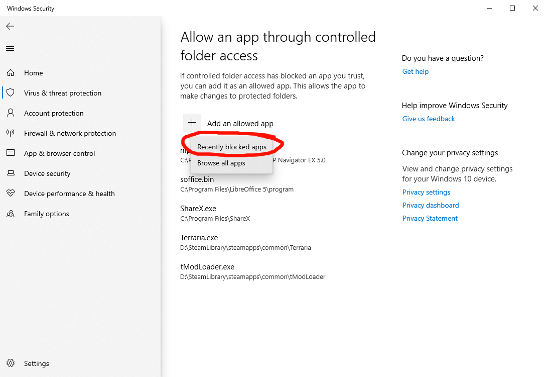 Left-Click "Add an allowed app", and select "Recently blocked apps"