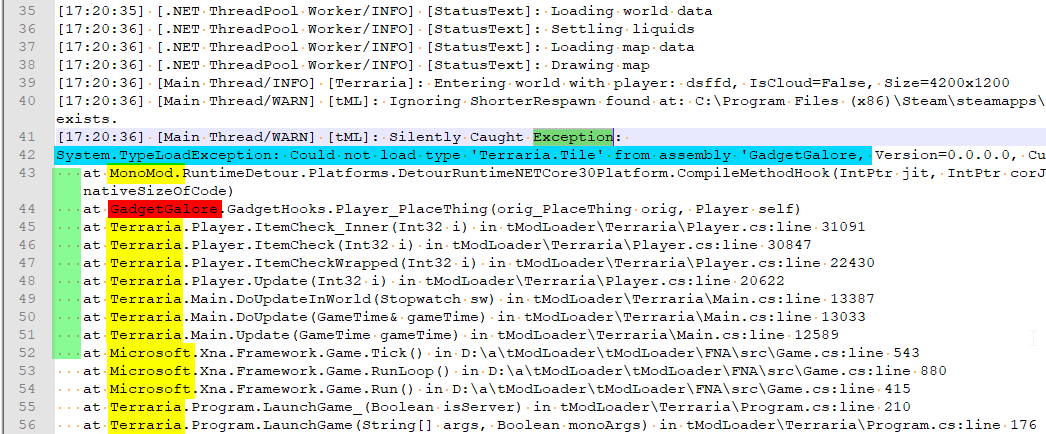 In the above excerpt from client.log, we can see an error is being logged. The error begins at line 41, with a brief summary on line 42 shown in blue. After the error summary, there will be a "stack trace" that shows where in the code the error is happening. Take note of the indentation of the lines of the stack trace, shown in green. This indentation is very useful for quickly finding errors logged in the log file rather than using crtl-f. Next, you'll want to look through the stack trace for the names of mods you have enabled. The first word after "at" on the lines and before the period is the key word you'll want to look at. Words like "Terraria", "Microsoft", and "MonoMod" can usually be ignored, you want to find the mod or mods that show in the error. In this example, we see a mod named "GadgetGalore" in the stack trace and can make the assumption that it is the cause of the error. If there are multiple mod names in a single stack trace, either mod could be at fault, or both, you'll have to do some testing. Now that we found a mod that is erroring, you can disable the mod and try again. Not every error logged in the logs will an actual bug, so some experimentation may be required. If you need help reading your client.log, you can ask for help in the support channels on the tModLoader Discord chat.