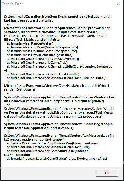 This error is an error usually caused by an unhandled error in a mod. This makes it hard for users to know which mod is broken. Much of the time this error will only happen after reloading mods (improperly unloaded Texture2D references), but it can happen due to other errors (for example, dividing by zero.) As a user of mods, it can be hard to figure out which mod is causing the issue. To determine the broken mod, follow the steps in Reading client.log. The mod causing the error causing this crash should be in the last or second to last entry. If you find a mod mentioned in one of those errors, that is likely the mod causing the error. If in doubt, ask in #support-forum on the tModLoader discord. As a last resort, use the flowchart.