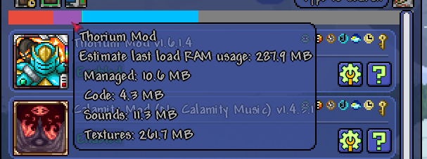 If you are curious which mods are using your limited Ram, you can enable the "Show Mod Memory Estimates" option in Settings->tModLoader Settings. After enabling the setting, you will have to exit to the main menu and then close and reopen the game for the setting to take effect. Visit the Mods menu, make sure you enable and reload the mods you are curious about, and you should now see colorful graph at the top that shows how much memory each mod is using. Use this information to disable mods that take too much ram compared to how much you enjoy the content.