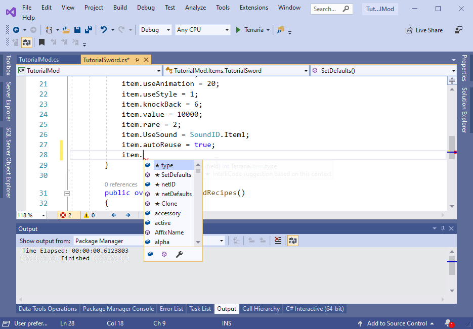 Click the Solution Explorer button to see the .cs files in your mod. You must open .cs files from here in order to correctly use Visual Studio. Let's make sure autocomplete is working. Open up Items\TutorialSword.cs and type item. on a new line after the existing item.autoReuse = true;. You should see the autocomplete popup show up: