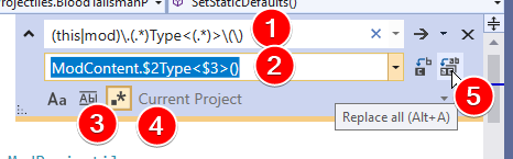 If you'd prefer the using static Terraria.ModLoader.ModContent; approach, do the following Find and Replace commands instead. These also require that Use Regular Expressions is enabled. You'll need to fix the calls in your Mod class to use ModContent.XType<>() manually: