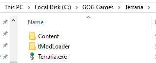 tModLoadereither next to or nested inside the Terraria install folder. On 1.4, if the folder contains a 'Build' folder, you will need to remove this intermediate folder and bring the contents up one level. (GOG usually installs toC:\GOG Games, and Steam toC:\Program Files (x86)\Steam\steamapps\common\Terraria. See this video to find the steam installation location if you customized it.) (If you are on linux and own the game on GOG, the nested option insideTerraria\gameis preferred) If you don't know how to unzip a zip file, get someone who knows how to use a computer to help you.-