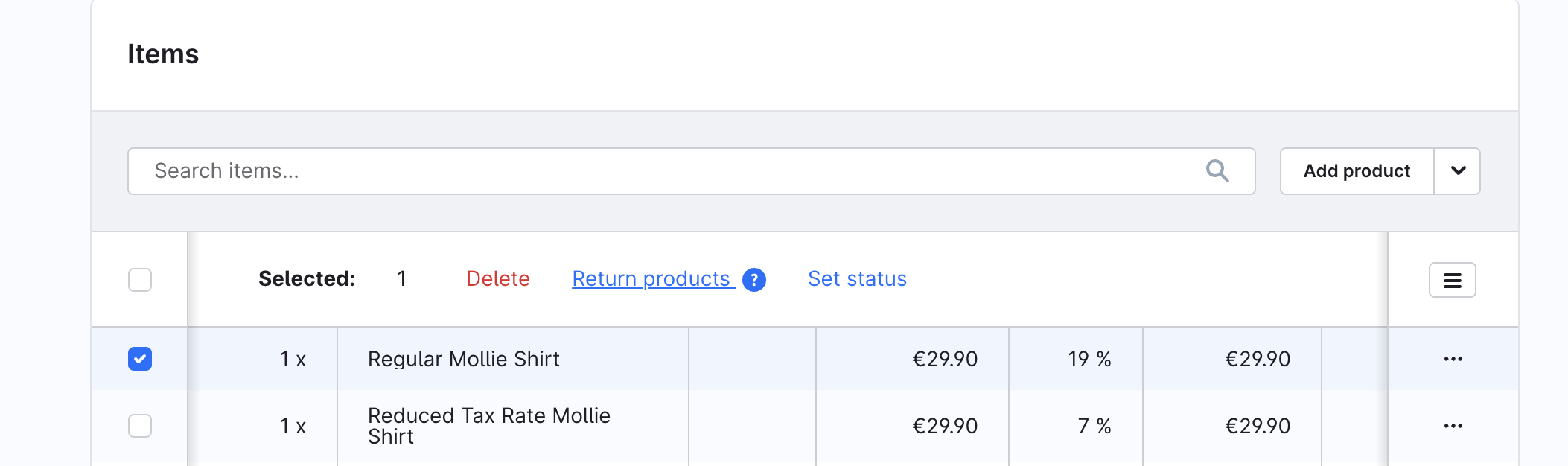 Start by opening an order in the Shopware Administration. Select the items you want to return and then click on "Return products".