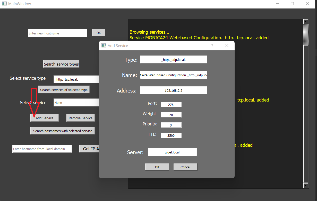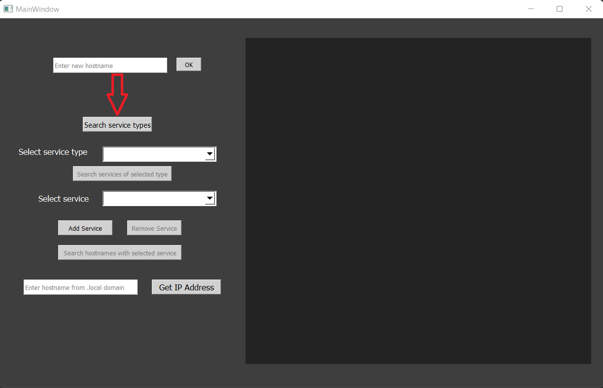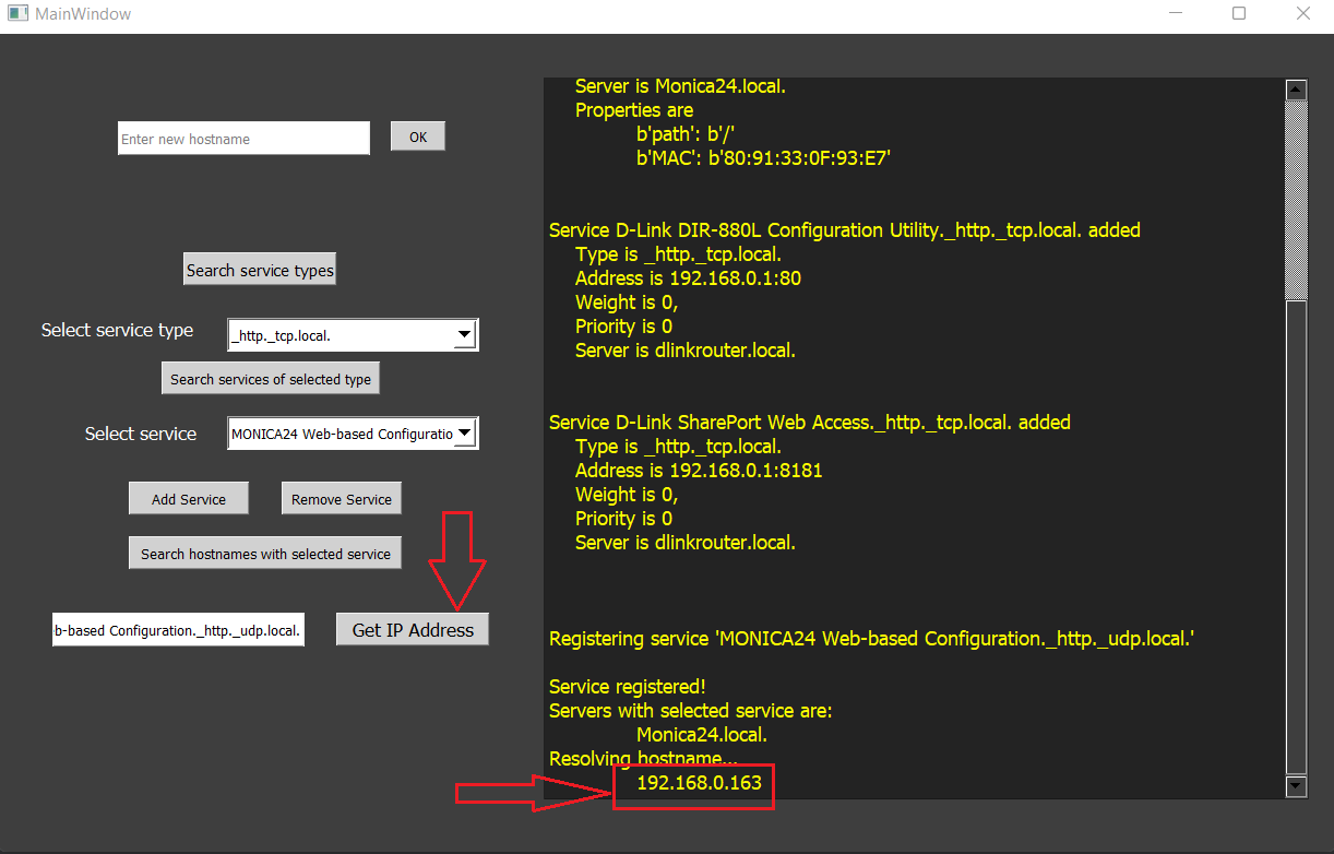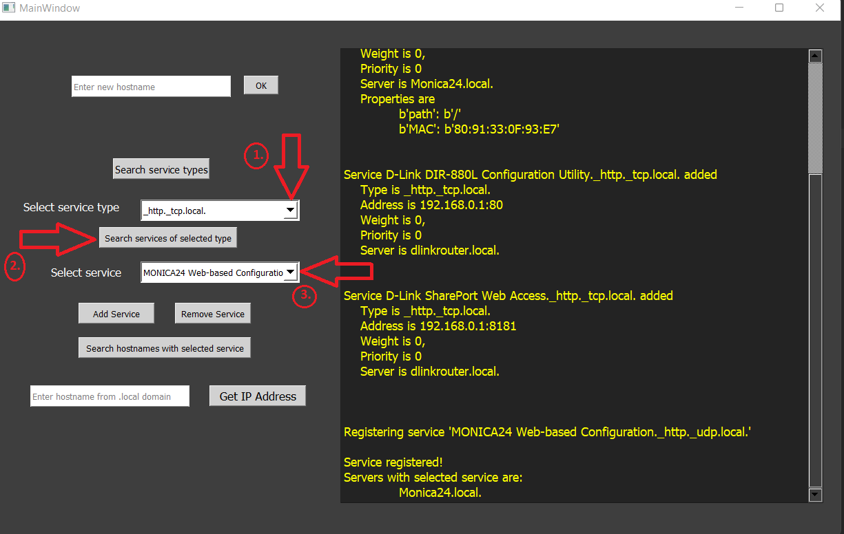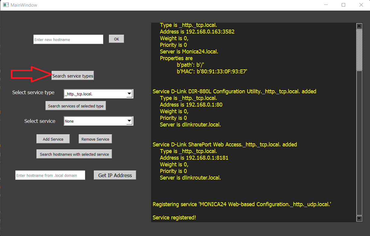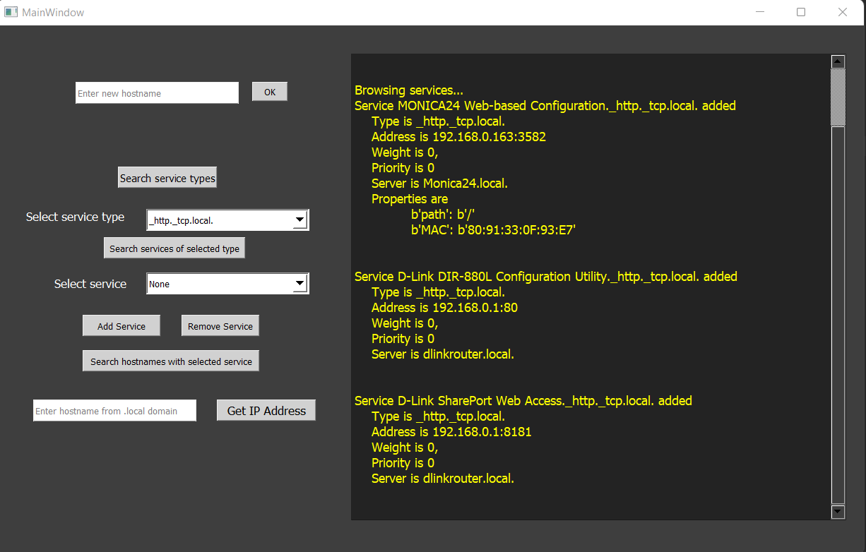 In interfata este construita o caseta de output cu toate tipurile de servicii care se regasesc in reteaua locala(.local). Generarea output-ului se va face prin butonul ‘Search service types’. Selectand tipul de serviciu, în urma apasarii butonului ‘Search services of selected type’ in output vor aparea mai multe informatii despre acel serviciu. Prin intermediul interfeței putem adăuga/elimina diferite servicii utilizand butoanele de ‘Add service’(care ofera suport pentru introducerea datelor dupa apasare) si ‘Remove Service’. Avem posibilitatea de a afla si IP-ul unui hostname din reteaua locala prin inserarea hostname-ului in caseta dedicata si apasand pe butonul ‘Get IP Adress’.