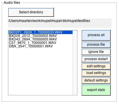 audio/experimentA/recordingA1.mat. All temporary files can be cleaned up by clicking on process restart. - By selecting a file and by clicking on ignore file, files can be disregarded from the processing and subsequent dataset creation.