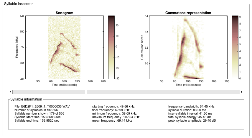 - The figure displays the sonogram and Gammatone filtered representation of the selected syllable.