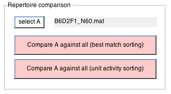 - Select a base repertoire (A) and compare it against all listed repertoires based on best match. The similarity matrix will be shown, together with the base repertoire where the repertoire elements are sorted according to best match (y-axis of the similarity matrix)