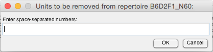- After a repertoire is build for a given data set, the user has the option to refine it. A text box window will display in which the user can provide the unwanted repertoire units to be removed from the repertoire. The repertoire will be updated (denoted with a '+' sign in the name).
