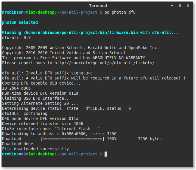 Building firmware locally for Electrons, Photons and P1s, and automatically flashing over USB using dfu-util or Over The Air using particle-cli. Sequentially flashing multiple devices at once over the air is also supported.