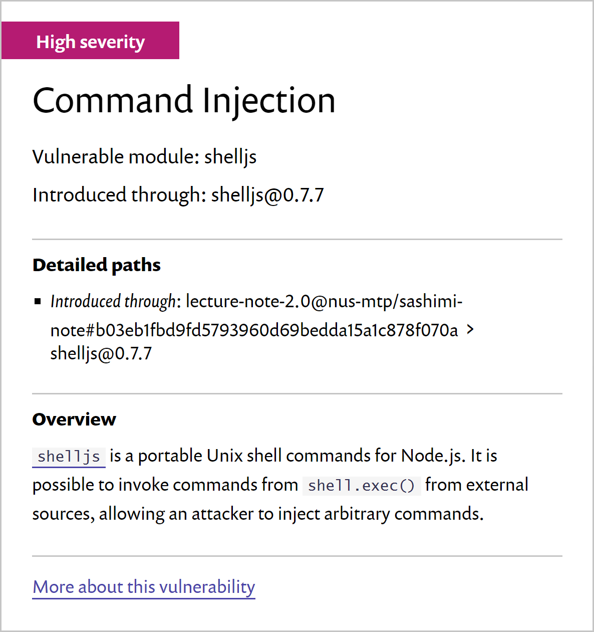 shelljsis used only for the development ofsashimi-noteand not the actual production server. Therefore there is no real security implications onsashimi-note's live web application. - The purpose of using