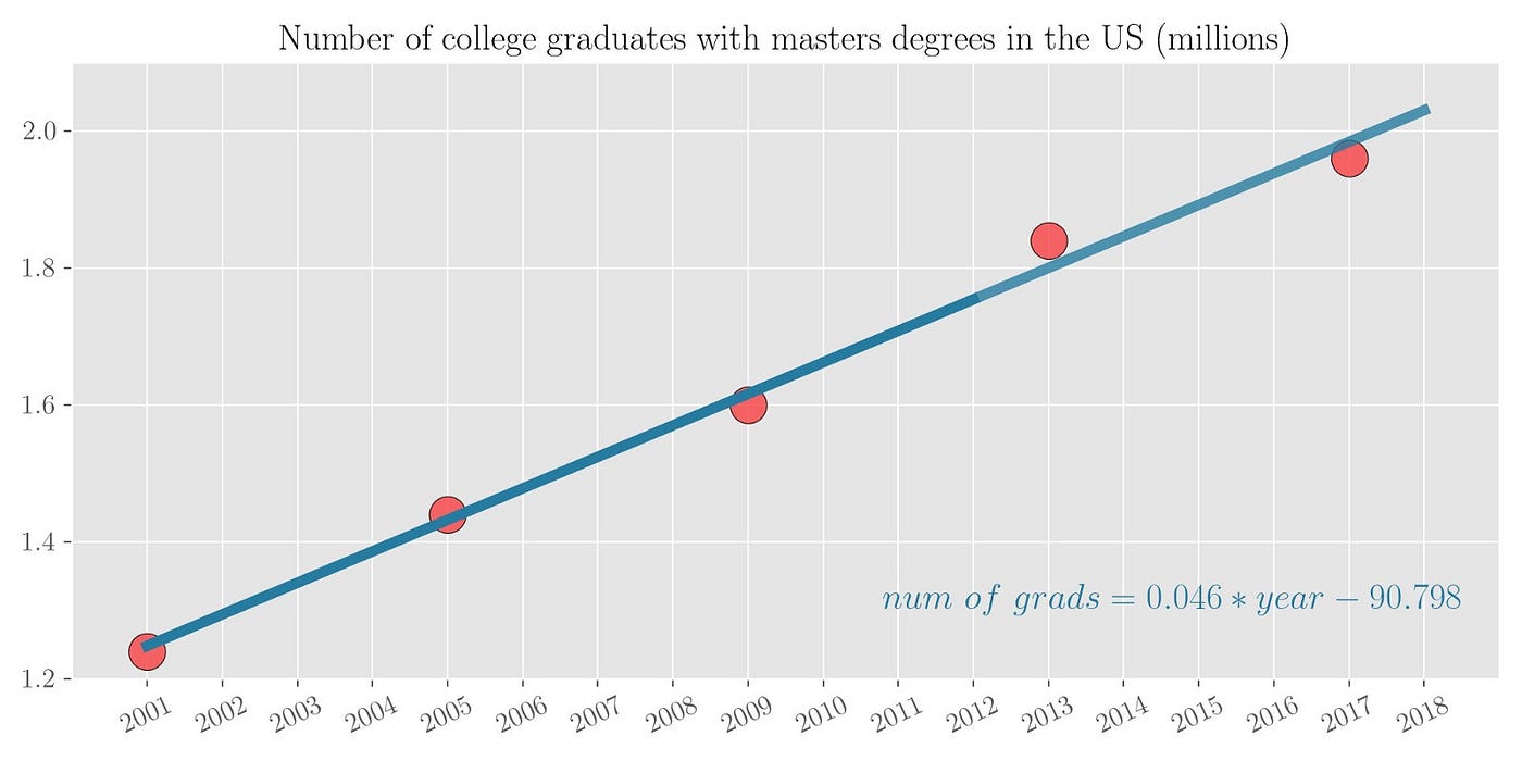 Assume we have access to limited data from the year 2001 to 2012, and we want to predict the number of graduates from 2013 to 2018. Since the number of graduates increases almost linearly with each year, it would make sense to fit a line to the dataset to assume the prediction. Then based on the actual dataset, we can see that the prediction is very close.