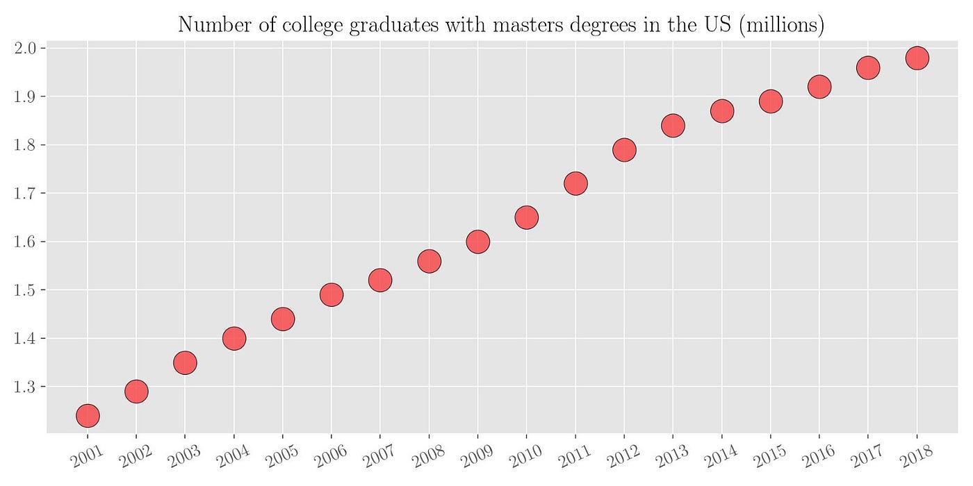 For context (from the graph on the left), suppose we have a graph with data points from the year 2001 to 2013 for the total number of college graduates with master's degrees. Based on the underlying pattern, you can assume and estimate it around 2.0-2.1 million.