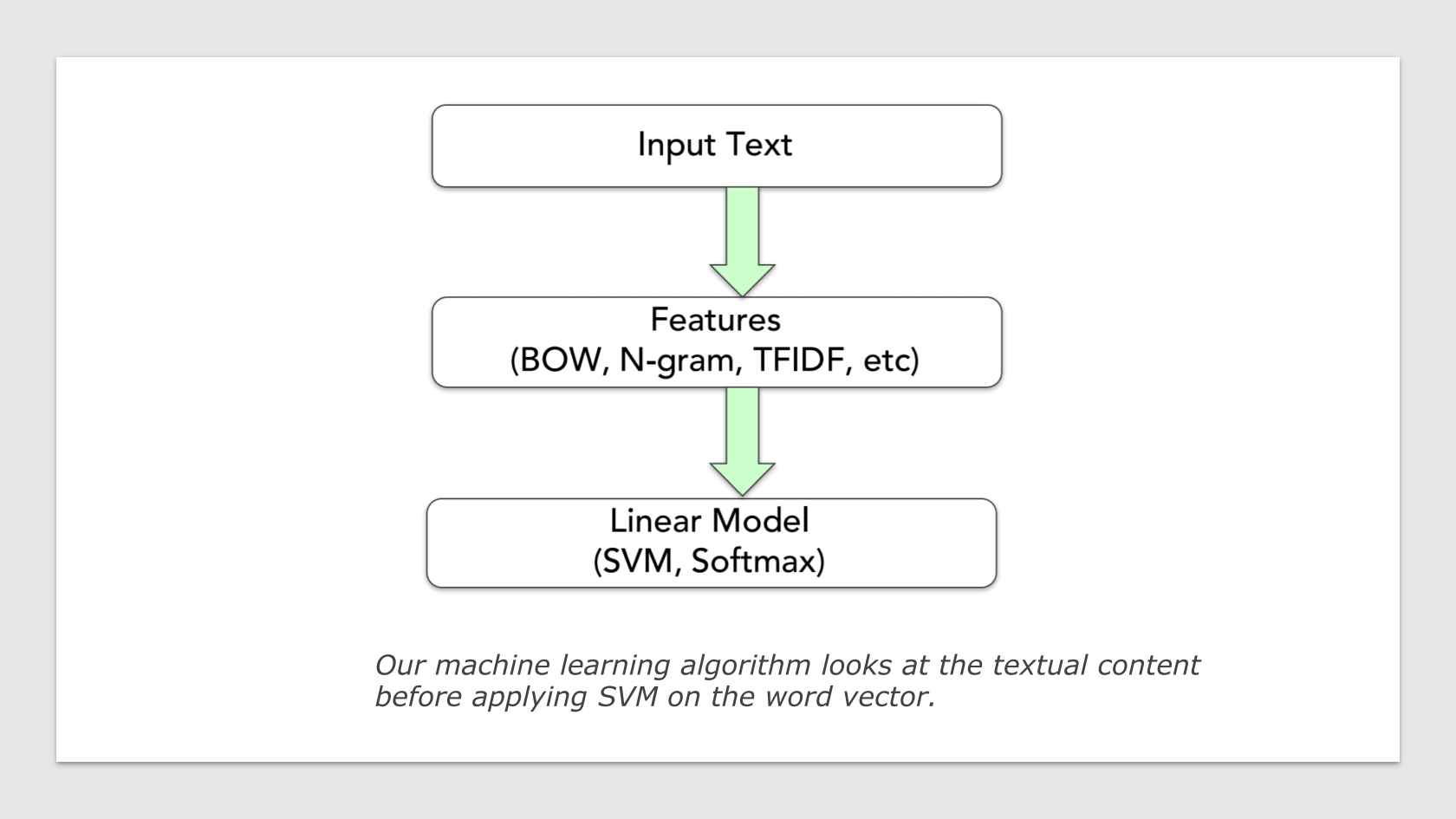 After pre-processing the text data, the corpus can be converted to useful features, which serves as inputs for algorithms (e.g. classification of words or prediction of next words).