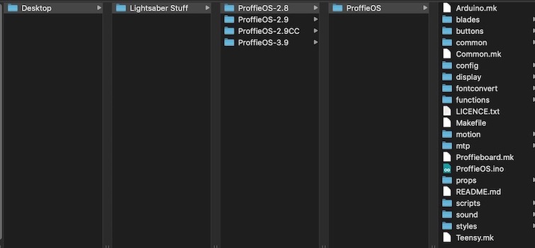 Note that as of the latest version, simply unzipping the software package creates the correct folder structure, whereas previously, some versions have required renaming folders and moving files and folders into a ProffieOS folder, and not everyone maintained the hierarchy correctly in doing so.
