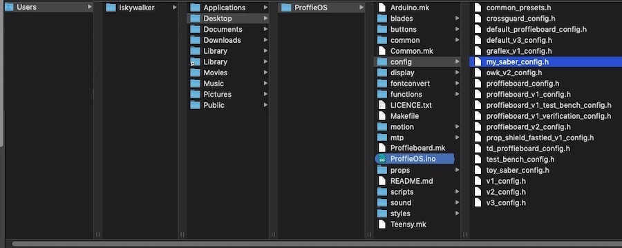 Another reasonable alternative is to organize things by saber, which could look like: C:\Users\Hubbe\Documents\Lightsabers\Graflex\ProffieOS\ProffieOS.ino