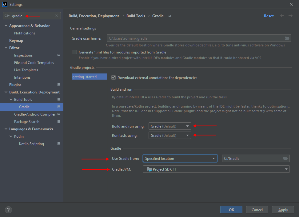 File -> Settings, в окне поиска ввестиgradle, в открывшемся пункте настроек выставить значения как на скриншоте;