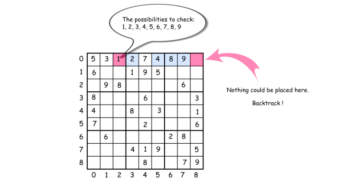 - The solver would carry on one step after another, in the form of recursion by the backtrack function. The backtracking would be triggered at the points where either the solver cannot find any suitable candidate (as shown in the above figure), or the solver finds a solution to the problem. At the end of the backtracking, we would enumerate all the possible solutions to the Sudoku game.