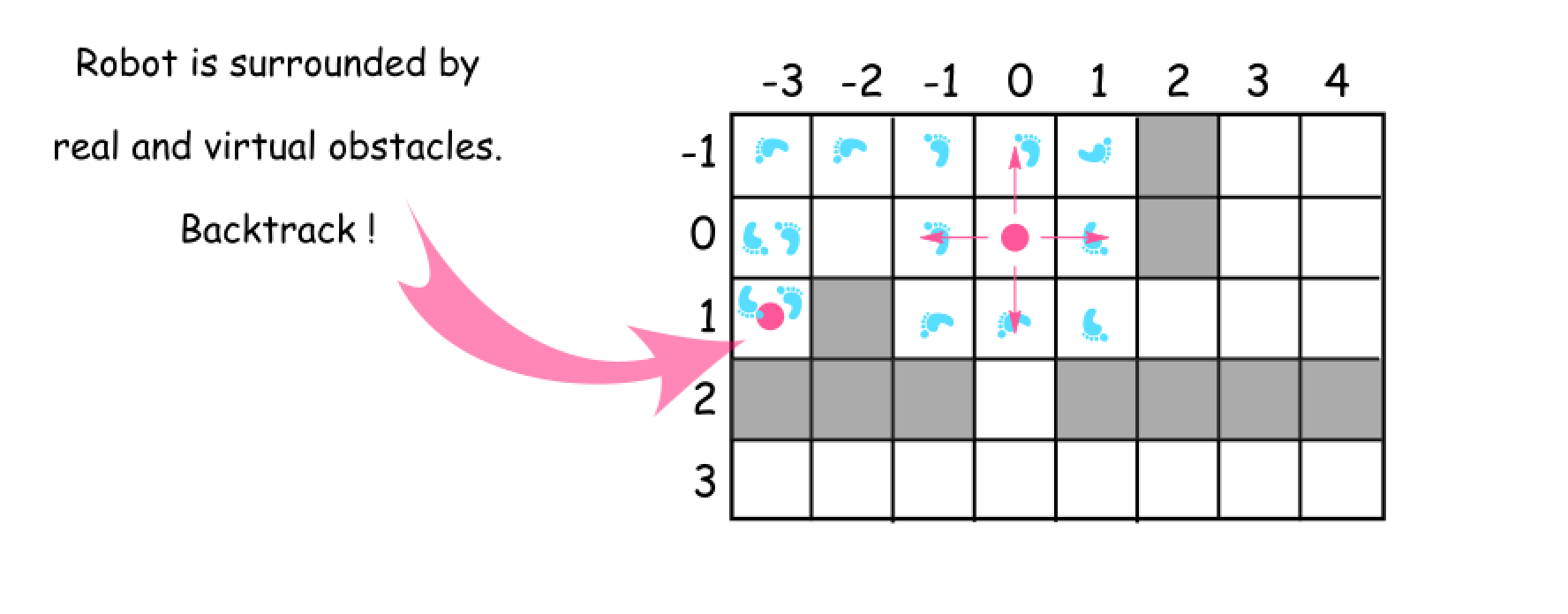 - The robot conducts the cleaning step by step, in the form of recursion of the backtrack() function. The backtracking would be triggered whenever the robot reaches a point that it is surrounded either by the obstacles (e.g. cell at the row 1 and the column -3) or the cleaned cells. At the end of the backtracking, the robot would get back to the its starting point, and each cell in the grid would be traversed at least once. As a result, the room is cleaned at the end.