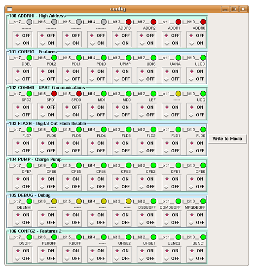 | The configuration utility runs separately from EMC2 and is used only to change the features shown. pyVCP is very limited in flexibility, so there were many compromises to the layout, but it does serve the purpose. GladeVCP might be better, but it was not available at the time. The LED's show the current status of the registers in the Modio. The radio buttons setup the data that will be sent to the Modio registers by clicking the Write button. The LED's update after the write is complete. Some of the radio buttons are graphically inverted and LED colors changed for features that are initially FALSE with the factory default settings. | ![]() |