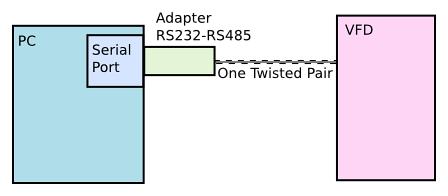 Typically a VFD with a Modbus option will offer a half-duplex RS-485 port for use with a single twisted wire pair cable. The port may use an RJ11 or RJ45 connector, so a telephone or network cable may be used. On the PC end, the cable connects to an RS-485 to RS-232 adapter on a serial port. Most half-duplex adapters should work if the RS-232 RTS signal is used to control the send/receive mode of the adapter. The adapter I've used cost just under $5 and is powered by the serial port pins. For long cable runs, an adapter with external power connection may be better.