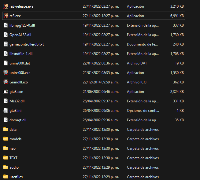 If you compile the "Debug" variant the executable will be only named re3.exe. The "Release" one will be re3-release.exe. Note that both libmpg123-0.dll and OpenAL32.dll are copied into the game folder.
