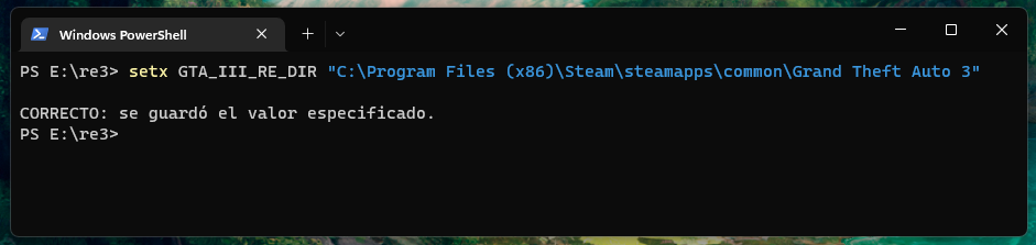 setxto define the directory where GTA is installed in your computer. Usually it's inC:\Program Files (x86)\Steam\steamapps\common\Grand Theft Auto 3. This is necessary to copy there3executable into GTA 3 directory after each build.